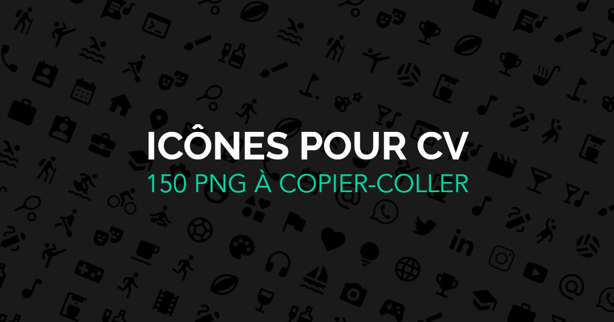 NB : Toutes les icônes ci-dessous sont au format .png sur fond transparent. Si vous cherchez où trouver des icônes pour CV au format vectoriel Indesign en .svg (vecteur), allez voir notre pack d'icônes pour CV.